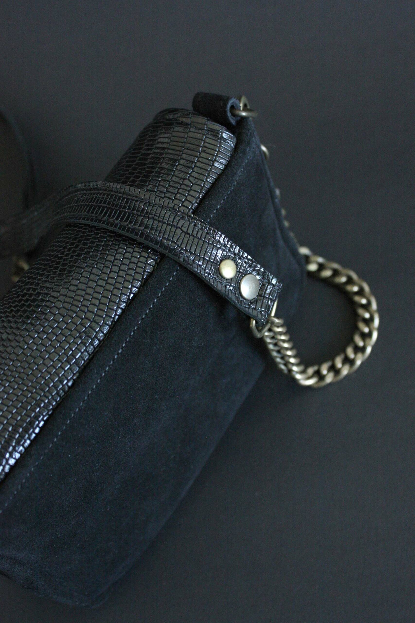 COMPOSITION : cuir de vachette façon reptile revalorisé et cuir velours de veau provenance Italie, doublure gabardine bleu marine 100% coton